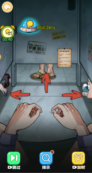 2、觀察廁所隔間下露出的雙腳及周圍情況,結(jié)合規(guī)則和場景細節(jié),分析哪個方向(箭頭所指)存在異?;蚍辖庵i邏輯。