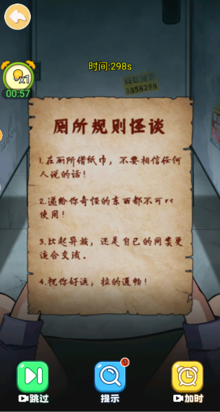 1、仔細閱讀 “廁所規(guī)則怪談”,牢記每條規(guī)則,這些規(guī)則是后續(xù)解謎和規(guī)避危險的關鍵指引,能幫助你在后續(xù)場景中做出正確判斷。