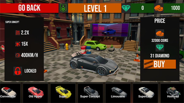 4、完成挑戰后會獲得許多游戲貨幣,然后玩家在這里可以用上你們的鉆石和硬幣了,可以改造喜歡的車,也可以購買車。