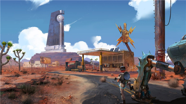 游戲中人物、武器、載具的設定十分“抓人眼球”,每一元素都擁有鮮明的廢土風格:一望無際的黃沙與高科技感的建筑,飽和鮮明的色彩搭配與濃重的美式漫畫風。
